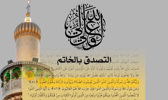 تمرّ علينا في اليوم الرابع والعشرين من شهر ذي الحجّة ذكرى تصدُّق أمير المؤمنين(عليه السلام) بخاتمه أثناء صلاته، ونظراً لأهمّية هذه الذكرى وما انطوت عليه من مفاهيم ومضامين لها أبعادها ودلالاتها العميقة، أنزَلَ الله تعالى فيها آيةَ الولاية فقال عزّ وجلّ: (إِنَّمَا وَلِيُّكُمُ اللّهُ وَرَسُولُهُ وَالَّذِينَ آمَنُواْ الَّذِينَ يُقِيمُونَ الصَّلاَةَ وَيُؤْتُونَ الزَّكَاةَ وَهُمْ رَاكِعُونَ * وَمَن يَتَوَلَّ اللّهَ وَرَسُولَهُ وَالَّذِينَ آمَنُواْ فَإِنَّ حِزْبَ اللّهِ هُمُ الْغَالِبُونَ).