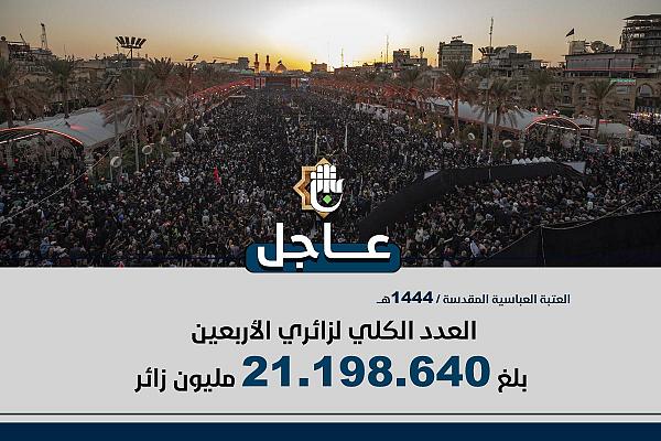 فبلغ عدد الزائرين الذين استقبلتهم مدينة كربلاء المقدسة من يوم ١ صفر الخير إلى غاية الساعة ١٢:٠٠ ظهراً من يوم ٢٠ صفر الخير، وفقاً لمنظومة العدّ الإلكتروني وعلى أربعة مداخل رئيسيّة، هي: (بغداد – كربلاء، نجف – كربلاء، بابل – كربلاء، حسينية – كربلاء – بمسارين) لهذه السنة حوالي : (٢١،١٩٨،٦٤٠ ) واحـدا وعشرون مليوناً ومـائـة وثمانيـة وتسعين الفاً وست مائة وأربعين زائـراً، وفي ما يلي جدول يبيّن مقارنة بالسنوات السابقة، سائلين المولى أن يتقبل من الجميع، وأن يوفقنا وإياهم لما يحب ويرضى إنه سميع مجيب .