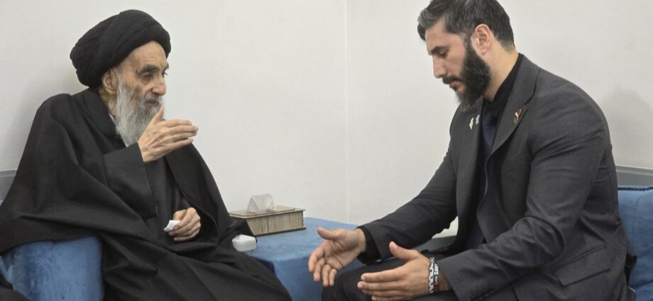 سماحة المرجع الدّيني الأعلى آية الله العظمى السّيد علي الحسيني السّيستاني دام ظلّه يستقبل الطبيب محمد طاهر الموسوي في مدينة النّجف الأشرف في العراق. الصورة من شفقنا