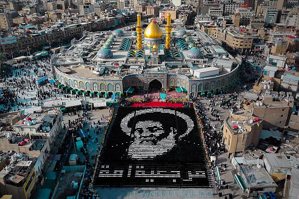 شكّل الطلبة المشاركون في فعاليات الحفل المركزي لتخرج طلبة الجامعات العراقية بنسخته الخامسة، رسمة فنية تجسد صورة المرجع الديني الأعلى سماحة آية الله العظمى السيد علي الحسيني السيستاني (دام ظله).