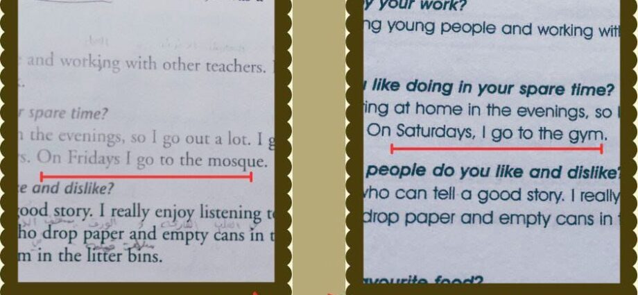 في الطبعة الجديدة لمادة اللغة الإنجليزية في منهج الصف الثاني المتوسط استُبدِلت عبارة (*أيام الجمعة أذهب الى المسجد*)..!! بعبارة(أيام السبت أذهب الى النادي الرياضي)..!!