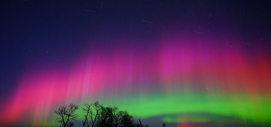 A Starlink train passing through auroras over rural Saskatchewan in November 2025.(Samantha Lawler), CC BY-NC-ND