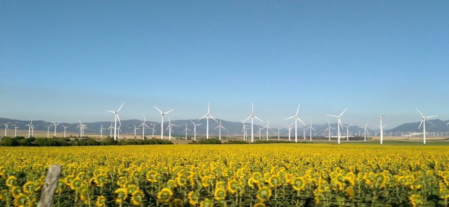 Wind farm above sunflowers in Spain, Europe’s second-largest generator of wind power. Photo by JOHANNA MONTOYA on Unsplash