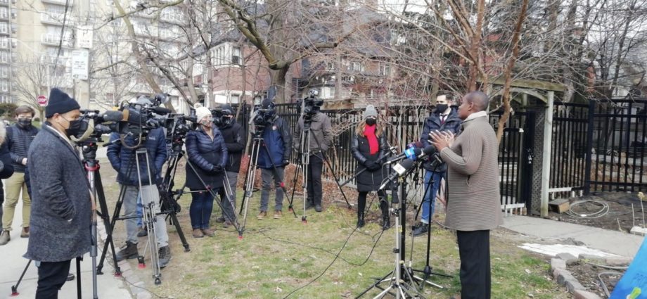 Federal Green Party Leader Annamie Paul speaks to reporters outside St. George’s Care Community in Toronto on Jan. 10, 2021. Photo Annamie Paul / Twitter. Carl Meyer, Local Journalism Initiative Reporter