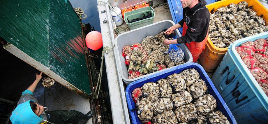 Shellfish farmer Rob Tryon and a farmhand prepare a harvest for market in 2014. Vancouver Island University research is looking at how heatwaves caused by climate change impacts aquaculture production. Quinn Bender/The Northern View