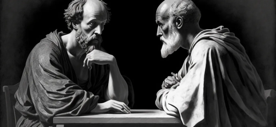 An AI-generated image of two philosophers in dialogue. Today’s AI-driven chatbots follow a rich history of dialogue that goes back to the philosophers of ancient Greece. Author provided