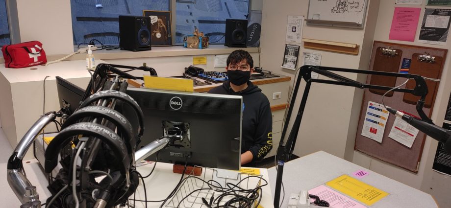 Cassidy Villebrun-Buracas is behind the scenes in the Victoria Campus and Community Radio studio located at the University of Victoria waiting for documentary applications to roll in. Photo by Catherine Lafferty, Local Journalism Initiative Reporter