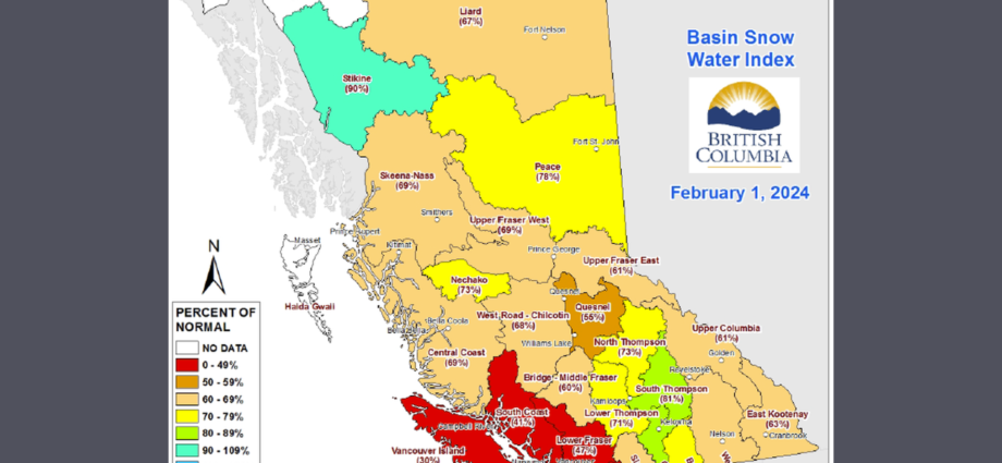 Vancouver Island is the hot spot of concern, with a snowpack that’s 70 per cent below normal. The south coast is 60 per cent lower, the Lower Fraser is 53 per cent lower and Quesnel is 45 per cent.