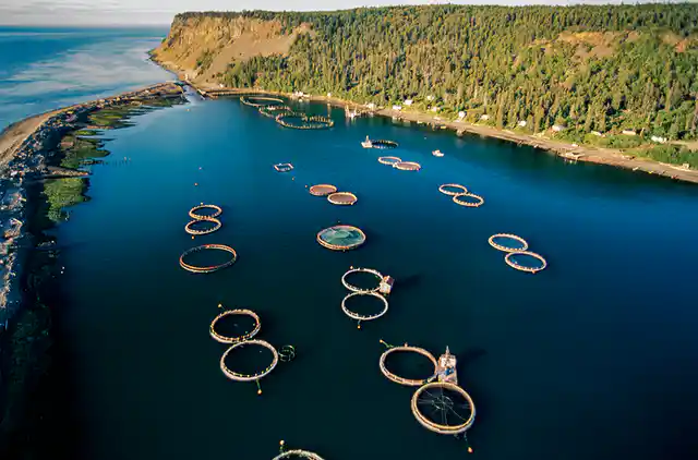 Aerial view of salmon fish farms, Grand Manan Island, N.B. (Shutterstock)