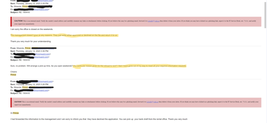 Screenshot of email exchange between Prince Sibanda and the rental office supervisor for 43 Thorncliffe Park Drive. Screenshot of email. Fernando Arce, Local Journalism Initiative Reporter, New Canadian Media
