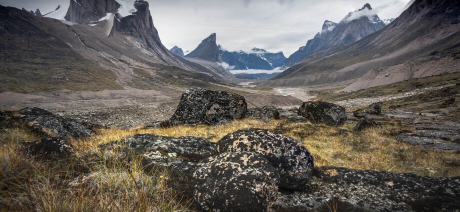 Wild Weasel River winds through a valley of Akshayuk Pass, Baffin Island. Mount Breidablik and Mount Thor are in the distance. (Shutterstock)