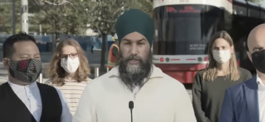 Federal NDP Leader Jagmeet Singh makes a public transit election promise in Toronto on Sept. 7, 2021. Screenshot via CPAC / YouTube