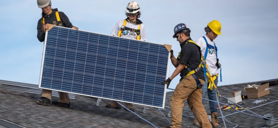 Fossil fuel industry and Indigenous community workers from the Luis Bull Tribe installing solar panels during the 2017 Louis Bull Daycare Project. Joan Sullivan / Iron and Earth