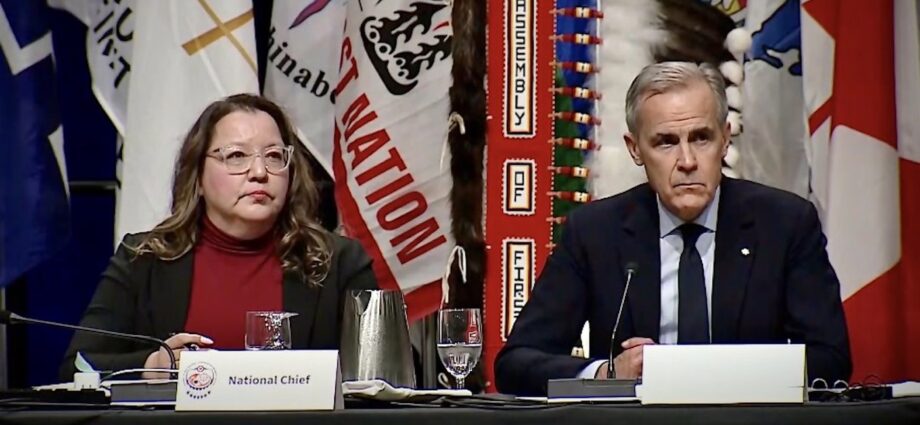 National Chief Cindy Woodhouse Nepinak and Prime Minister Mark Carney at an AFN assembly Dec. 2 where Indigenous leaders voted unanimously for the withdrawal of the pipeline pact and in support of BC First Nations opposed to lifting the oil tanker ban. CPAC screen shot. Rochelle Baker, Local Journalism Initiative Reporter, Canada’s National Observer
