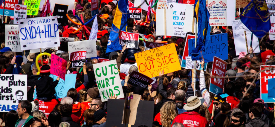 Tens of thousands of people gather in Toronto to protest the Ontario government’s cuts to education in 2019. Photo by Alexander Gold/ Shutterstock.