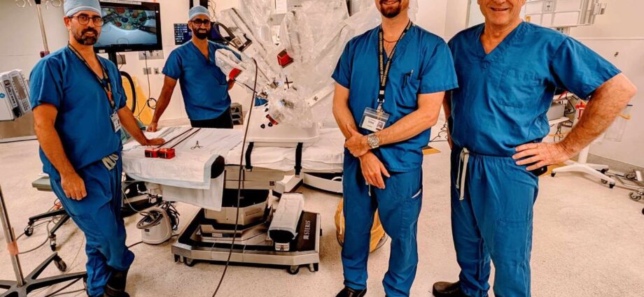 Left to right are colorectal surgeon Dr. Sunil Patel, colorectal surgeon Dr. Ameer Farooq , thoracic surgeon Dr. Andrew Giles, and colorectal surgeon Dr. Hugh MacDonald, around their robot, the Da Vinci Xi from Intuitive Surgery. Photo by Michelle Dorey Forestell/Kingstonist. Michelle Dorey Forestell, Local Journalism Initiative Reporter, Kingstonist.com
