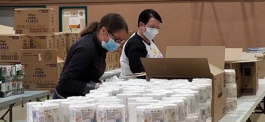 Residents preparing hampers for distribution in La Ronge at the hight of the pandemic. Merriman said doses of the Moderna vaccine are being distributed in La Ronge this week. Photo by Michael Bramadat-Willcock, Local Journalism Initiative Reporter.