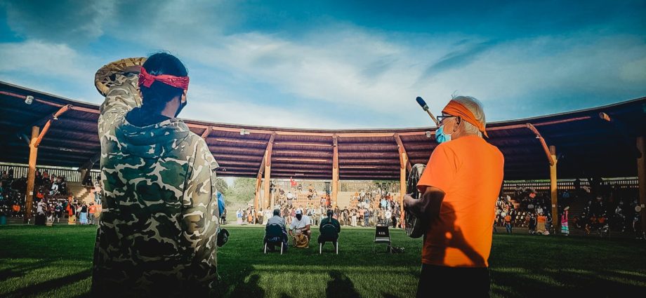 The drums roared throughout the Tk’emlups pow wow arbour as my son Skookamina sang alongside my Papa Norman Retasket, a KIRS survivor who spent ten years at the school. Photo by Kelsie Kilawna, Local Journalism Initiative Reporter, The Discourse