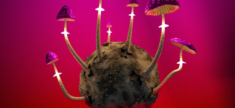 Pink glowing Psychedelic mushrooms on a magic piece of land. Photo by Igor Omilaev on Unsplash.