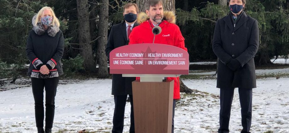 Heritage Minister Steven Guilbeault speaks to media as Infrastructure Minister Catherine McKenna, Environment Minister Jonathan Wilkinson and Prime Minister Justin Trudeau listen in. Guilbeault photo / TwitterCarl Meyer, Local Journalism Initiative Reporter