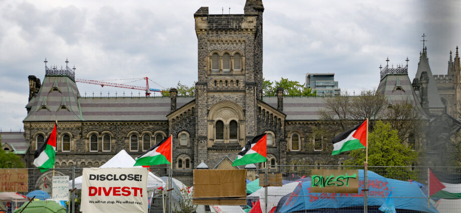 Pro-Palestinian demonstrators, students and faculty members have set up tents on the front lawn at King’s College Circle at the University of Toronto since May 2, 2024. Photo by Can Pac Swire/ Flickr. CC BY-SA 4.0 Deed