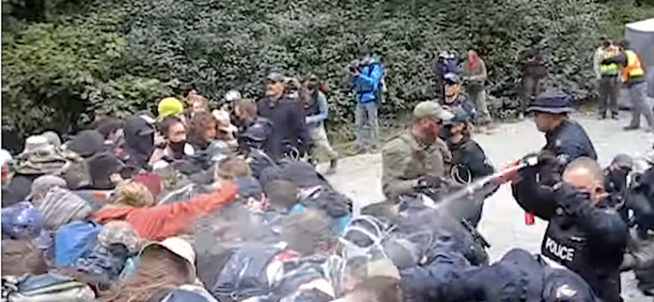 RCMP officers can be seen using pepper spray on Fairy Creek old-growth protesters on Saturday in online videos. Photo YouTube screen shot.